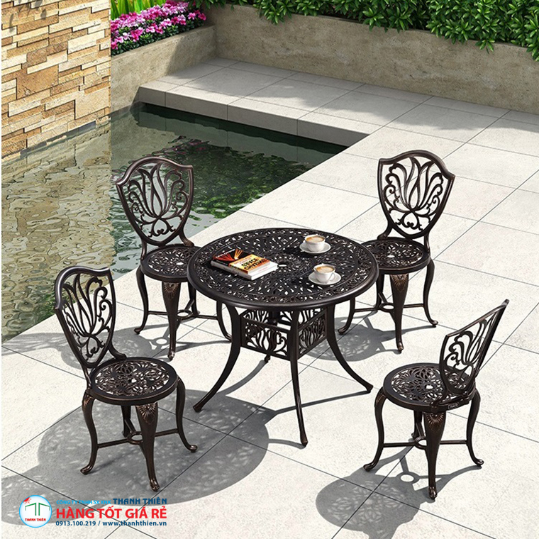 Bộ bàn ghế nhôm mang vẻ đẹp hiện đại, sang chảnh. Trải qua quá trình sản xuất bằng phương pháp đúc nên nó sở hữu sự tinh tế trong từng chi tiết. Các đường nét hoa văn ở trên sản phẩm này cũng làm tăng vẻ sang trọng, góp phần tạo nên nhiều mẫu mã khác nhau đáp ứng nhu cầu khó tính nhất của người dùng.