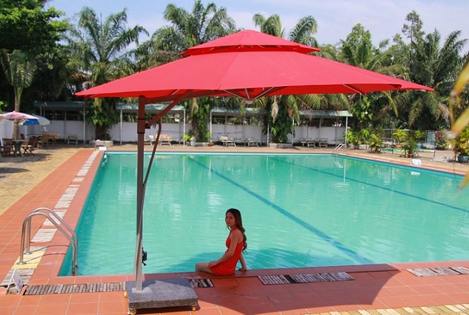 Ở không gian bể bơi sẽ thích hợp sử dụng dù lệch tâm có màu sắc nhẹ nhàng như màu kem để tạo cảm giác dịu mát, dễ chịu để nghỉ ngơi sau khi bơi xong. Bên cạnh, bạn cũng có thể chọn dù lệch tâm màu xanh nước biển để tạo sự đồng nhất với bể bơi. Với ưu điểm có tán rộng của dù lệch tâm giúp tạo khoảng che chắn được khoảng không gian rộng cho bể bơi của bạn.