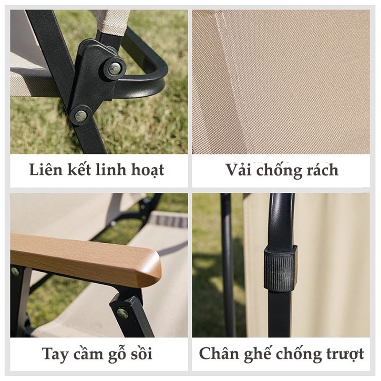 - - Phần sau lưng ghế xếp dã ngoại có túi lưới đựng đồ và vật dụng cá nhân, sách báo tạp chỉ - Phần để tay 2 bên ghế được làm bằng gỗ sồi cao cấp, vân gỗ tự nhiên tạo cảm giác thoải mái khi ngồi và rất thẩm mỹ
